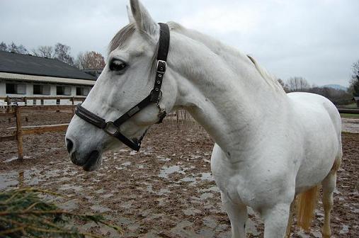 Die schwarzen Streifen auf der Nase sind keine Wirbel oder so, sondern Serreta-Narben als bleibendes Andenken an die Zeit in Spanien. Tico ist ein P.R.E.-Wallach und jetzt 10 Jahre alt. Er stammt - soweit ich es erfahren konnte - aus einer Stierkampfzucht und wurde dort nach einem Trainingsunfall ausgemustert. Quer über die Stirn hat er auch eine große Narbe.