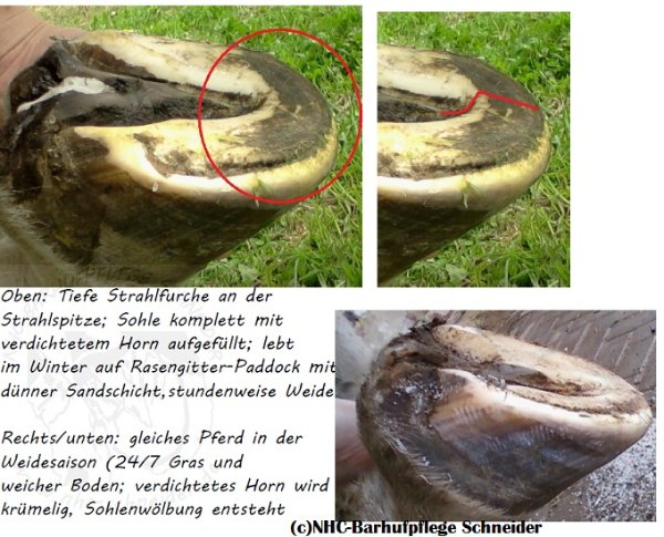 erkennt man anhand der strahlfurchentiefe an der richtigen (!!!) Strahlspitze. oft ist aber die Strahlspitze mit irgendwelchem Bröselhorn verwachsen und lang nach vorne gezogen. schneidet man den Strahl passend zurück, hat man spontan wieder wölbung, weil man das ganze überschüssige gebrösel entfernen kann