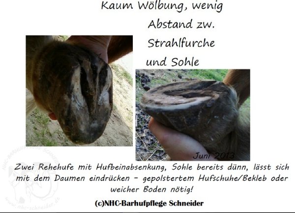 Quelle: https://www.dhgev.de/forum/archiv/aktue ... 26920e4205"Deutlich weniger als 1 cm ist bei einem kompletten, gesunden Hufbein und einem WB ziemlich sicher ein Zeichen, dass die Sohle nicht dick genug ist. Die Hufbeinform ist am gleichen Pferd an Hinter- und Vorderhufen meist so ähnlich, dass die Sohlenwölbung innerhalb von +-5 mm übereinstimmt. Wenn dein Pferd also hinten 2cm Sohlenwölbung hat und vorne nur z.B. 0.7 cm, dann hast dein Pinto ziemlich sicher gute Hinterhufe aber noch viel zu dünne vordere Sohlen."