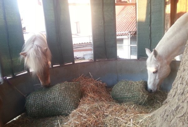 zwei Netze sind an den Gittern vor Fenstern angebunden (jaa, statt feuerwehrkarabiner könnte man was ungefährlicheres nehmen) und drei netze sind in der Raufe auf dem Boden festgebunden. Boden ist im vergleich zur Standfläche der Pferde ca 30cm höher. alle netze nurt einseitig angebunden, bei zwei befestigungspunkten hätte ich tatsächlich sorge, dass sie mit nem bein in die schlaufe geraten könnten. so stehen sie halt mal auf nem leeren netz, die maschen sind aber so klein, dass kein Fus reinkann und beshclagen ist bei uns niemand