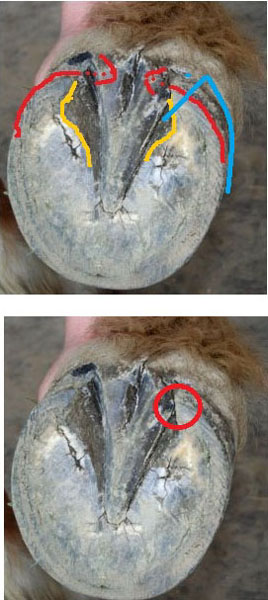 Wenn man den Verlauf der Hufwand mit den Fotos von Blue vergleicht, sieht man, dass sich die Trachten "anschauen" (rote Linien). Die Verlängerung dieser linien würde noch am Huf aufeinander treffen. Die Eckstreben (gelbe Linien) sind ebenfalls ganz aus der Form gequetscht. Zum Vergleich habe ich eine korrekte Eckstrebe samt Hufwandverlauf rechts im Bild in Blau eingezeichnet.