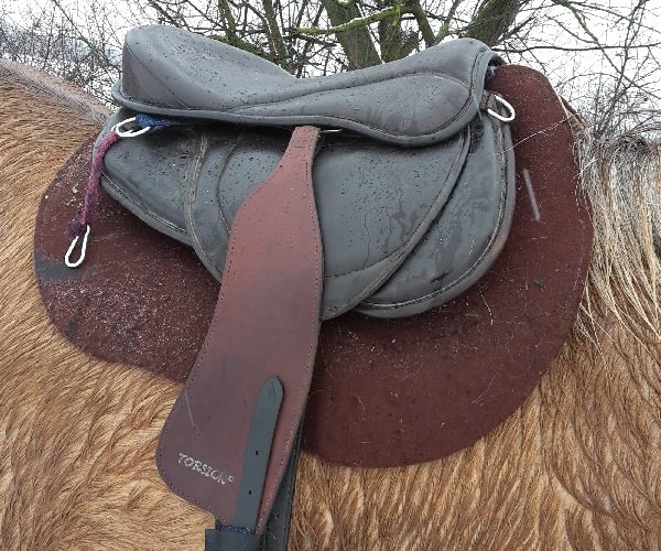 das Pad ist Eigenbau und hat eine große Polstertasche unten drunter, befüllt für den Sattel mit dünner evazote und äh... dünnem Abstandsgewebe zum pferd hin, weil ich dachte, vllt belüftet das den Rücken :lol2: wirds nicht können, so eingequetscht zw Filzlagen, aber nun. WS war ohnehin schon frei gepolstert