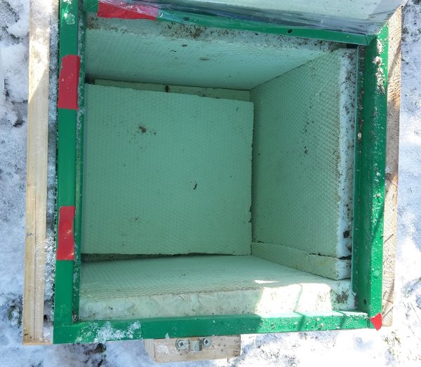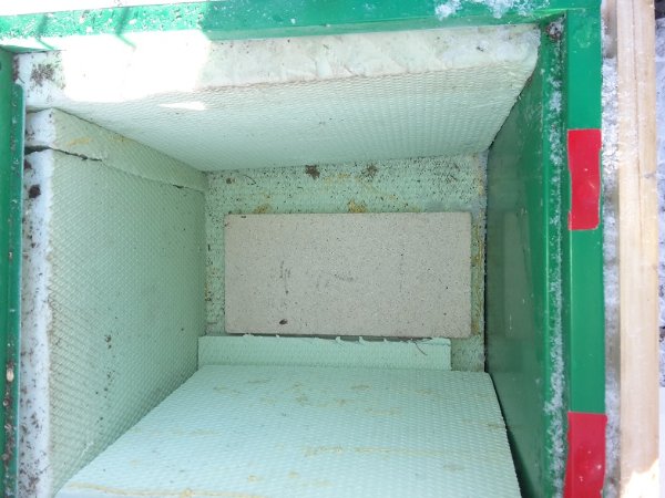 Innen gedämmt mit STyrodurplatten (lagen hier noch rum), eine Seite ist von außen gedämmt, das ist eigenltich der Kistenboden, das passte so einfach besser. auf dem BOden der Cobskiste liegen eine platte Styrodur, dann eine Lage STyrodur und Scharmottestein, dann wieder ne Platte Styrodur