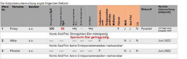 Die erste Untersuchung ist März 2022. Finlay ist behandlungsbedürftig und da wir wussten, dass die Spulwürmer in der Aufzucht nicht auf Ivermectin reagieren gab es Pyrantel.
