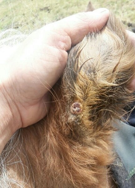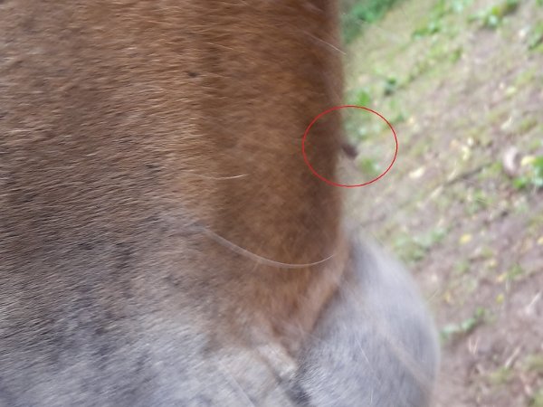 aktuell sitzt eine schorfschicht drauf. lässt sich schlecht knipsen, weil wir fliegeninvasionen haben. sobalnd man die Maske lupft, fressen die das Pferd an und selbiges shaked wie wild... versuch ich die Tage mal nachzureichen