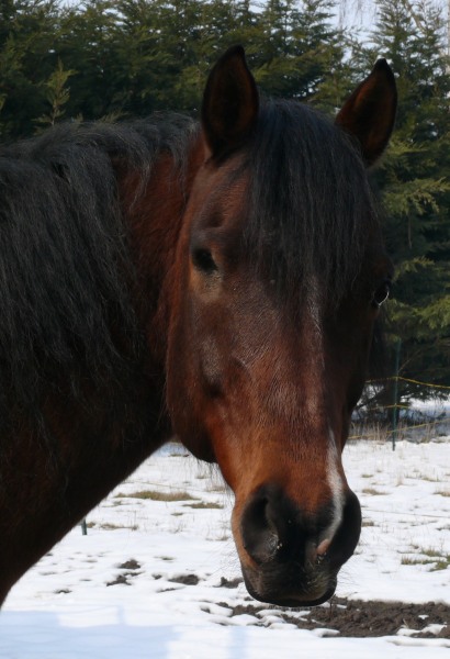 Ich musste feststellen, dass er sich von der blinden Seite auch nur ungern fotografieren lässt. Ich wollte vor einigen Tagen mal die Fellverfärbung (dunkler, großflächig um die Augen herum) am Kopf dokumentieren und fotografierte mit Blitz im Stall. Das hat ihn doch sehr erschreckt und seither darf ich mit der Kamera kaum auf der blinden Seite sein - auch nicht aus 5 m Entfernung.