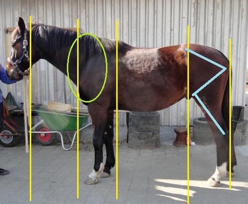 Habe mal ein bisschen gemalt. Die gelben Striche sind Unterteilungen Hinterhand/Mittelhand/Vorhand/Hals. Im Idealfall sollte das Verhältnis 1:1:1:1 betragen. Hier sieht man, dass der Rücken "zu lang" und Vor- und Hinterhand "zu kurz" sind. Bei der Vorhand macht das nicht so viel, wenn man nicht gerade einen Dressurstrampler haben will, aber die Hinterhand wirkt schon arg schmächtig.