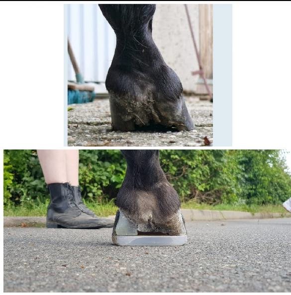 Eine Größe breiter und im Zusammenhang mit vernünftigem, geraderichtendem Training auch angeglichener von der Höhe. Allerdings geht auch das wirklich gute Training nur, wenn die Hufe passen. Und so schließt sich dann der Kreis.