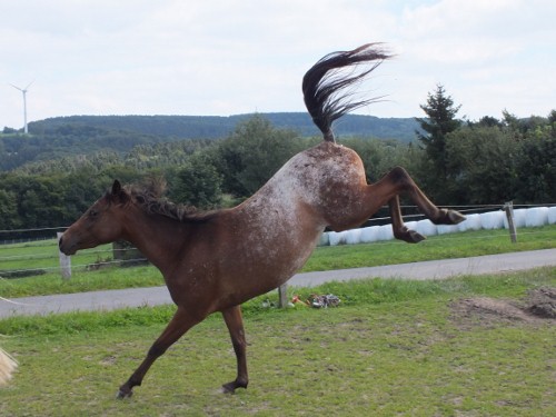 Maxi steht ja mit einer weiteren 2-jährigen und 2 Jährlingen auf der Koppel und ich bin am Überlegen ob ich nicht mal z.B. mit einem Gymnastikball oder einer Plane auf die Koppel marschier und alle viere bespaße - alleine hat Maxi grade keine Lust, außerdem haben wir auch keinen Reitplatz o.ä.