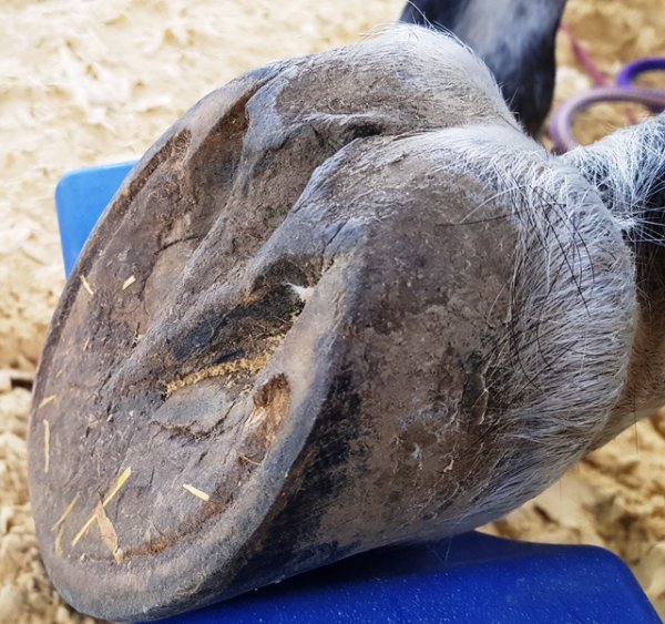 komprimiertes, ewig belassenes Sohlenhorn wird ziemlich hart. allein daran erkennt man es nciht unbedingt. manchmal findet man unter ner steinharten hornschicht plötzlich ne lage brösel-Krümelkram. würde ich hier aber nciht erwarten