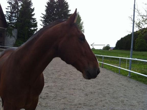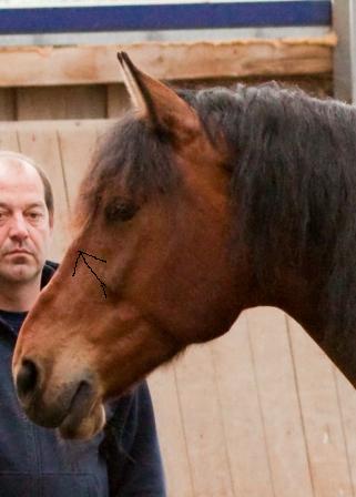 Das Kinn wirkt angespannt (auch das kann eben durch die Momentaufnahme kommen). Ist dies häufig der Fall, lässt es auf einen unvernünftigen Charakter schließen, dem es schwefällt sich zu ändern und die Tendenz hat mit dem Reiter zu kämpfen. Letzteres besagt auch die abfallende Maulpartie.