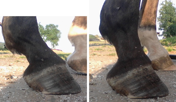Der Huf vorne links ist bearbeitet (das am weißeren Bein) und das andere ist unbearbeitet