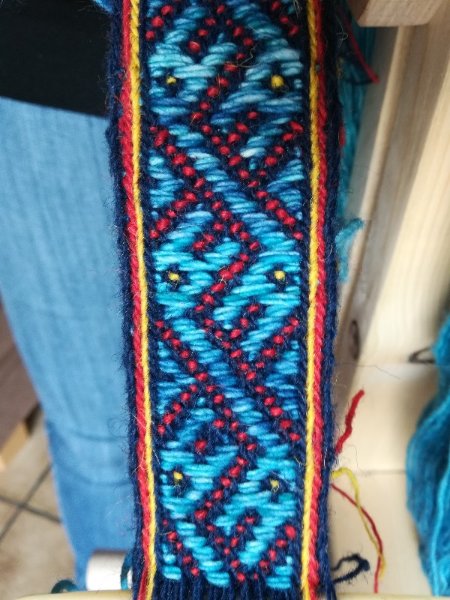 Mal was ganz anderes: Mein erster Versuch mit einer broschierten Brettchenborte. Die Breite ist nicht ganz konstant, aber für den ersten Versuch bin ich ganz zufrieden :-)