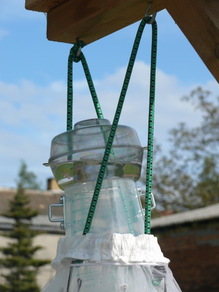 Der Ball imitiert einen Pferdehintern. Bremse will da hin und stechen/beißen, stellt fest, dass es kein Pferdepopo ist und fliegt wohl meistens eher nach oben Richtung "Himmel" weg. Dort ist nun das feine Netz/weißer Trichter, in dem sie nun nach oben fliegt. Ganz oben befindet sich die fotografierte Falle mit Wasser und einem Zugang von unten. Der Übergang zwischen Reifrock und Falle sollte möglichst ohne Absätze sein, damit die Bremsen schnell aufsteigen und dann ertrinken. Das ist bei uns leider nicht so richtig gegeben und man sah letztes Jahr immer wieder Bremsen unterhalb der Falle im Netz sitzen.