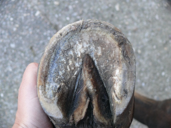 Die Hufe sind im Trachtenbereich zu hoch, der Strahl ist zu klein und hat keinen Bodenkontakt, die mittlere Strahlfurche erscheint mir tiefer, die würde ich ausschneiden und falls notwendig behandeln.