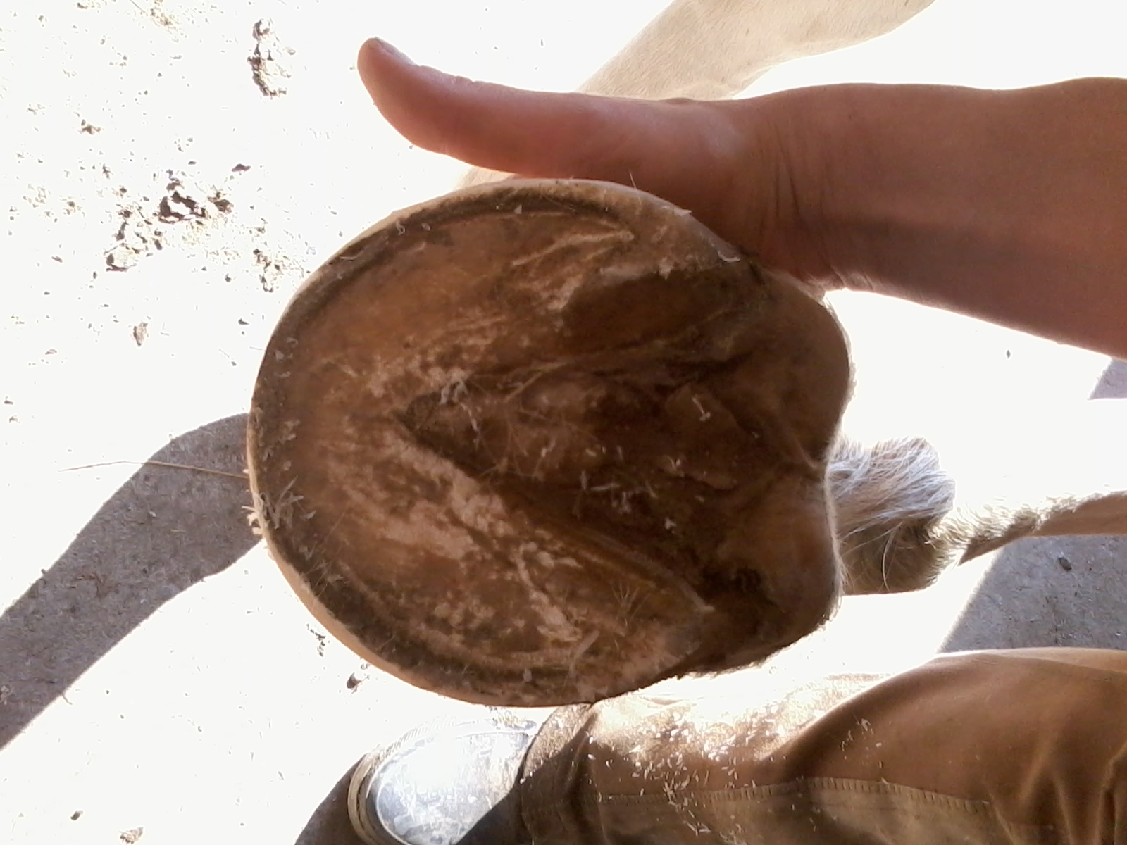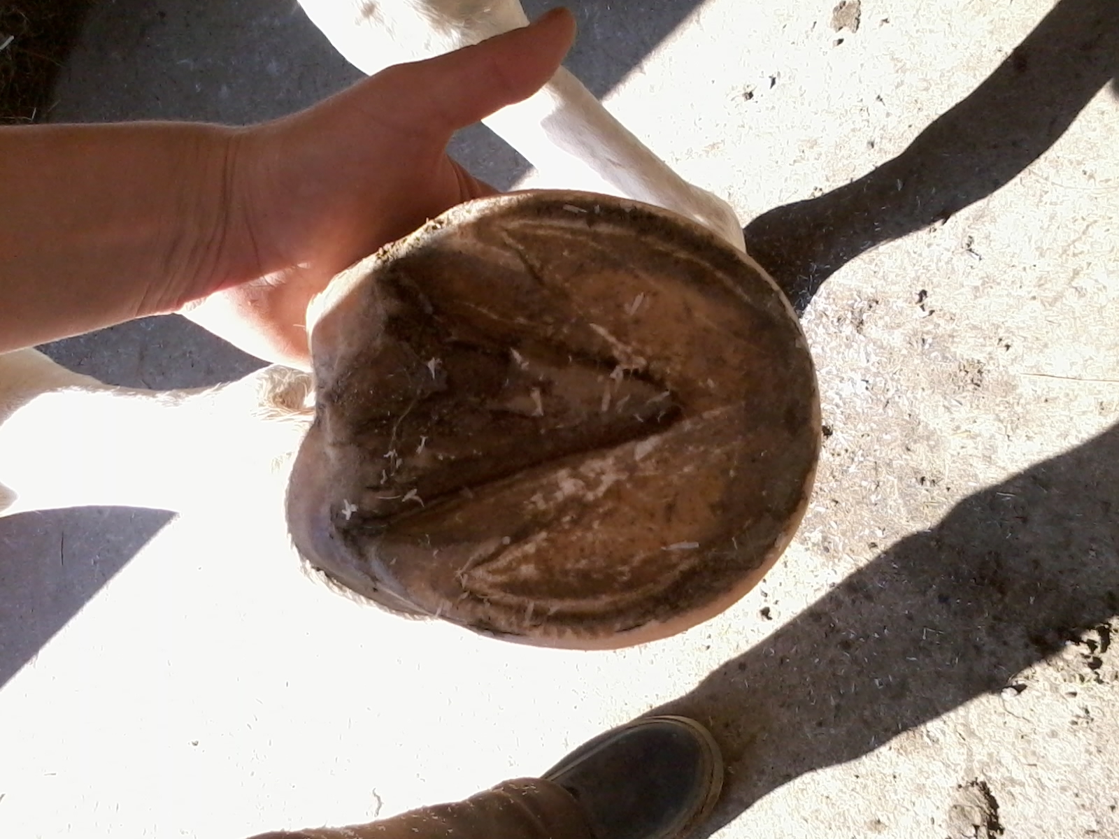 Der Riss in dem Huf stammt von einem üblen Ballentritt in den Kronrand. Ich vermute, sie hat sich dort so verletzt, dass an der Stelle nur noch Narbenhorn gebildet werden kann. Es wird aber stetig besser, der Riss ist jetzt komplett zu und nur noch eine Rille. Es ist lange nicht mehr so schlimm wie es auf dem Foto wirkt.