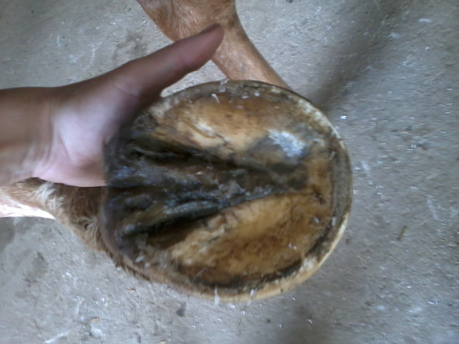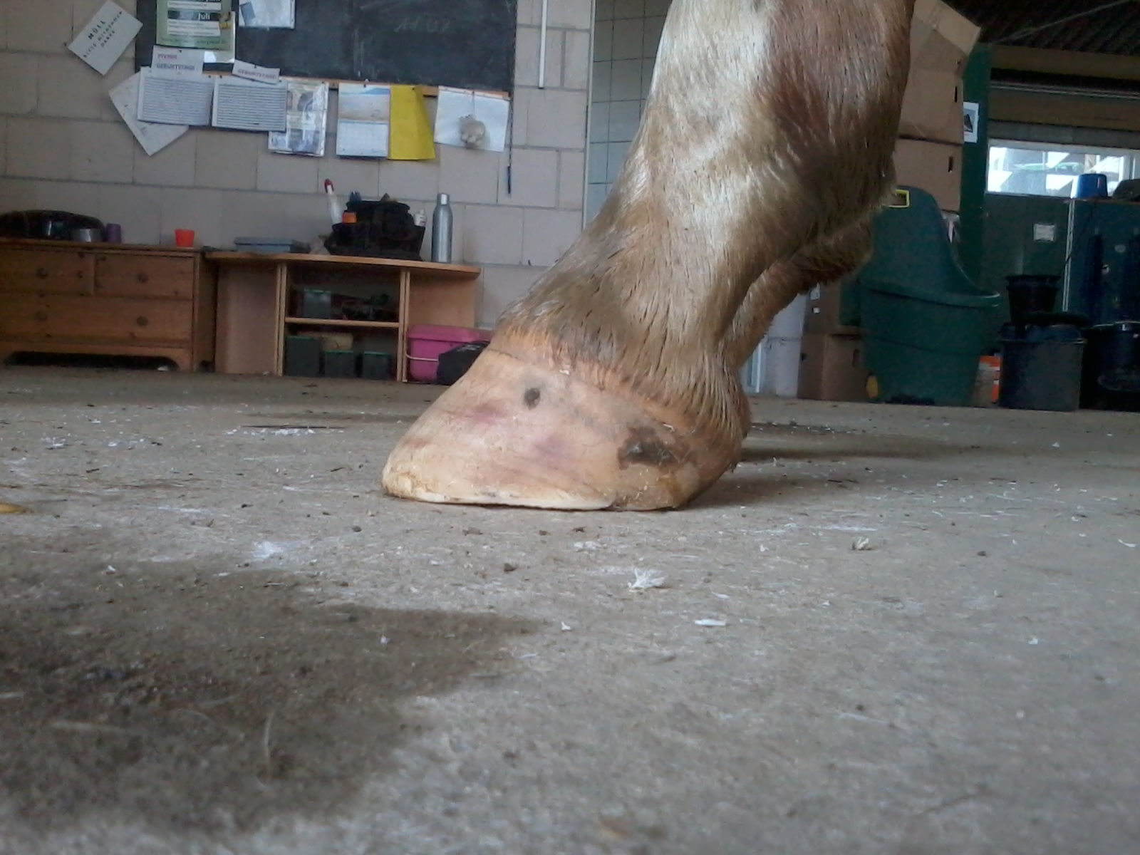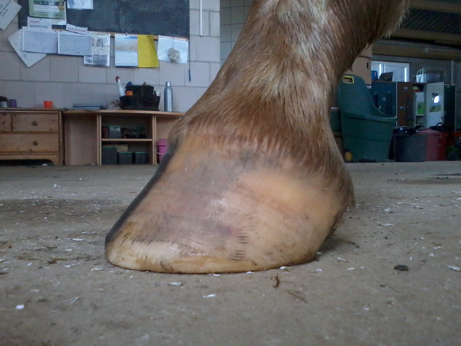 Die schwarzen Schatten auf dem Huf sind normal, das hat mir ihrer Scheckung zu tun. Der Kronrand ist außen etwas hochgeschoben, innen beult die Wand daher etwas aus... Sie steht aber auch nicht 100% gerade vorne.