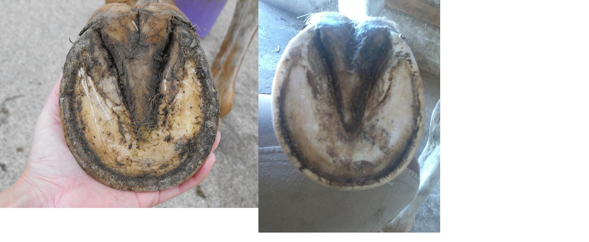 Der Strahl ist definitiv breiter geworden, die Trachen haben sich aufgerichtet und gehen jetzt bis zum Ende vom Strahl. Die mittlere Strahlfurche hat dieses Jahr etwas unter der Feuchtigkeit gelitten. Was man auf den Fotos nicht erkennen kann, der Strahl trägt inzwischen gut mit, das war letztes Jahr noch überhaupt nicht der Fall. Auch ist die Zehe kürzer und die Schiefe nicht mehr ganz so ausgeprägt (ob sie jemals ganz weg geht weiß ich nicht, sie steht nicht 100% gerade)
