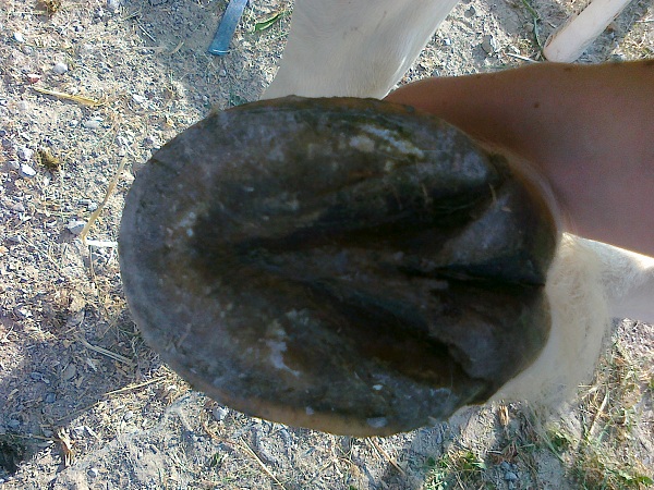 Die mittlere Strahlfurche hat sich schön geöffnet und für mich sieht es so aus, als ob die äußere Hufwand irgendwie kräftiger geworden ist. Ich kann leider aus dieser Perspektive nicht die kürzere Zehe erkennen. Ich hoffe, die Hufe von meinem Dicken sehen einiges Tages auch mal so aus...