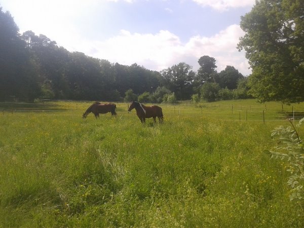 Also gaaanz so ohne lief es jetzt doch nicht ab. Ich war nicht dabei, aber anscheinend hat mein Künstler den F. doch am Freitag mal ordentlich über die Koppel gejagt. F. hat sich dann nicht mehr in den Stall getraut. Ich hab's dann so gemacht, dass ich immer wenn ich kam beide im Stall gefüttert habe. Pablo fand das fast aufregender als F. Nachts waren sie bis Sonntag getrennt. Samstag standen sie dann nach dem füttern noch ne Weile zusammen im Stall und gestern, als es so warm war, auch recht viel. Gestern Abend hat sich F. an Pablos Hintern geschubbelt