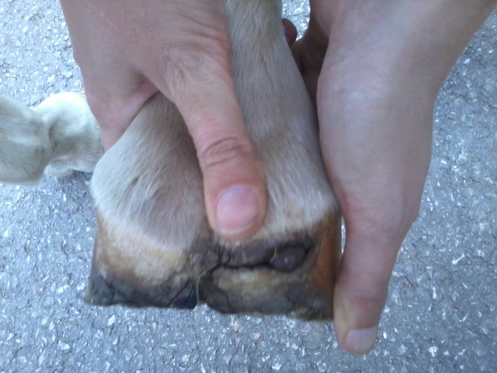 Entweder ist Charmer sich vorne reingelatscht (wieder mal), oder aber es ging (unentdeckt und ohne jegliches Lahmen, daher eher unwahrscheinlich) ein Hufgeschwür auf. Jedenfalls war dort zuerst ein Riss. Diesen haben wir lediglich täglich desinfiziert.