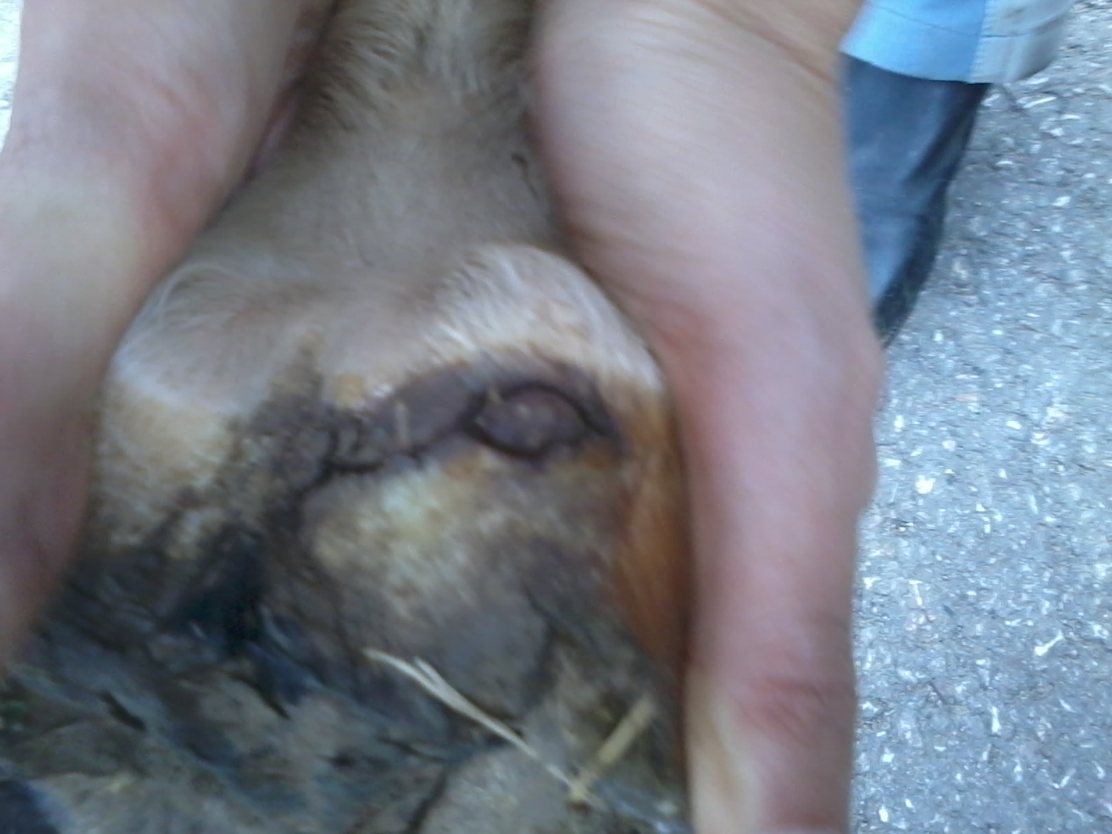 Es ist so ein richtiger Knubbel, den man bewegen kann. Wenn man ihn "anhebt", dann ist er nicht ganz fest, unten drunter ist noch Wunde. Drumherum fühlt sich das Gewebe normal an. Der Knubbel ist eher ein bisschen hart, glatt in der Oberfläche. Hufe sind beide gleich warm, nicht heiß.