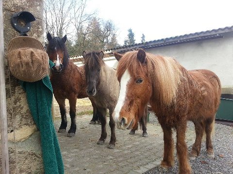 wollte euch dieses nette Foto nicht vorenthalten. Ich bin so stolz auf meine Mädels: rechts Harka 28, Mitte Skrollan 3 und links unser Kaltblutmix Bella 9. Sie stehen artig am Anbindeplatz ohne jegliche Halfter o.ä.