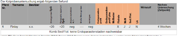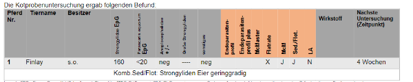 Bei der Kontrolluntersuchung waren bei Finlay die Spulwürmer weg, aber Pyrantel konnte nicht alle Strongyliden beseitigen ( dass es da gelegentlich Resistenzen gibt ist auch bekannt). Er war aber unter der Behandlungsgrenze, so wurde geschaut ob er es selbst hinbekommt oder nicht, deswegen wieder erneute Beprobung "erst" nach 4 Wochen.