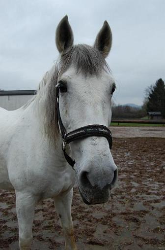 Die schwarzen Streifen auf der Nase sind keine Wirbel oder so, sondern Serreta-Narben als bleibendes Andenken an die Zeit in Spanien. Tico ist ein P.R.E.-Wallach und jetzt 10 Jahre alt. Er stammt - soweit ich es erfahren konnte - aus einer Stierkampfzucht und wurde dort nach einem Trainingsunfall ausgemustert. Quer über die Stirn hat er auch eine große Narbe.