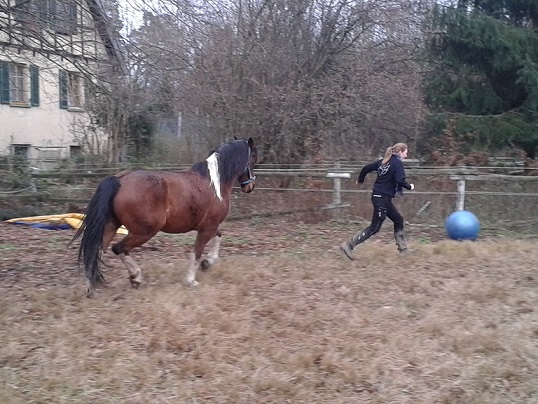 Allerdings forderte ich ihn nie zum Rennen auf, wenn er das nicht möchte - wenn er nicht auf Schnalzen oder Hopsen von mir reagiert, ist es ok - ich würde ihn dann nie drängen. So lange er will, bockt und tobt er rum - wenn er nicht mehr möchte, sucht er Kontakt zu mir. Ich bin da extrem vorsichtig - denn er ist einfach ein riesiger Brummer.