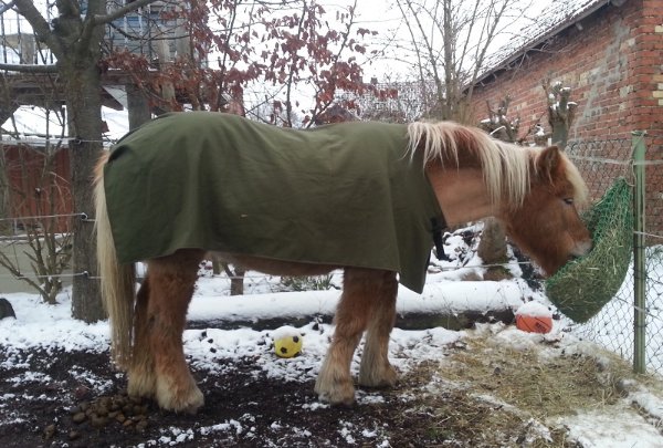Was dabei deutlich auffällt: im Gegensatz zu Fleece scheint Wolle null Ambitionen zu ahben, mit dem fellstrich nach hinten zu rutschen. die liegt morgens noch genau da, wo man sie abends hinplatziert hat. Schade eigenltich, dass es keine wasserdichten Decken mit Wollfutter gibt! Ich bilde mir auch ein, das Pony hat unter Wolle ein netteres "Klima" - Decken mit Fleece müffeln immer recht fix bei ihr, die Wolldecken tun das gar nciht.
