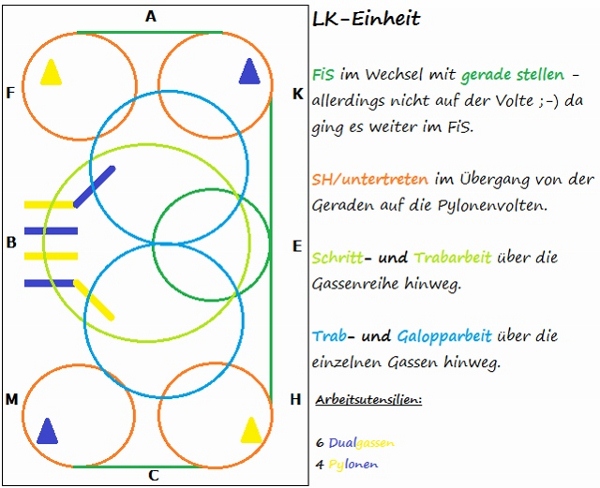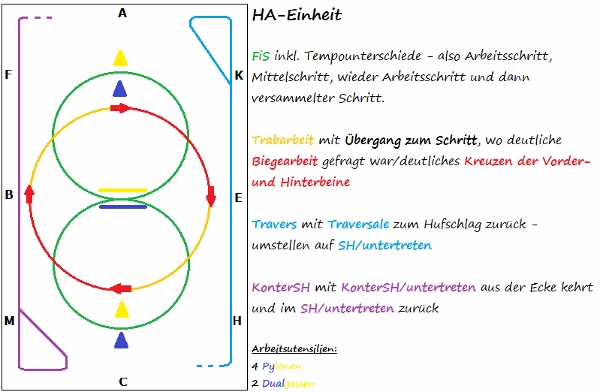 Diese Zeichnung hier ist von Kanuffel. Es soll das Voltenverschieben an der langen Seite darstellen, wo man das Pferd nach der Volte geradeaus laufen lässt um es dann wieder auf die Volte einzuladen. Die Übung ist im Schritt/Trab und für Fortgeschrittene im Galopp meister bar.