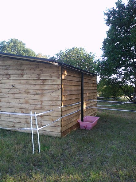 Dann haben die pferde sich nur ungern darin aufgehalten, warum weiss ich nicht. Bilbo legt sich wohl mal hin, aber am liebsten liegen sie halt ausserhalb der huette, links daneben, dort ist windschutz. Da habe ich dann auch stroh aufgeschuettet im winter - aber rosa mag da so gar nicht reingehen... (bilbo ist 1m35, rosa 1m65)
